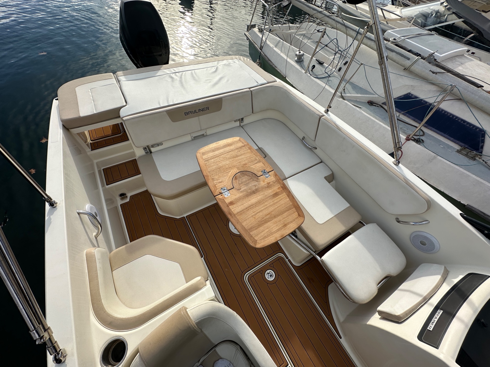 Teck synthétique neuf (2025), bâches d'hivernage avant et arrière, bimini couvrant l'intégralité du cockpit.