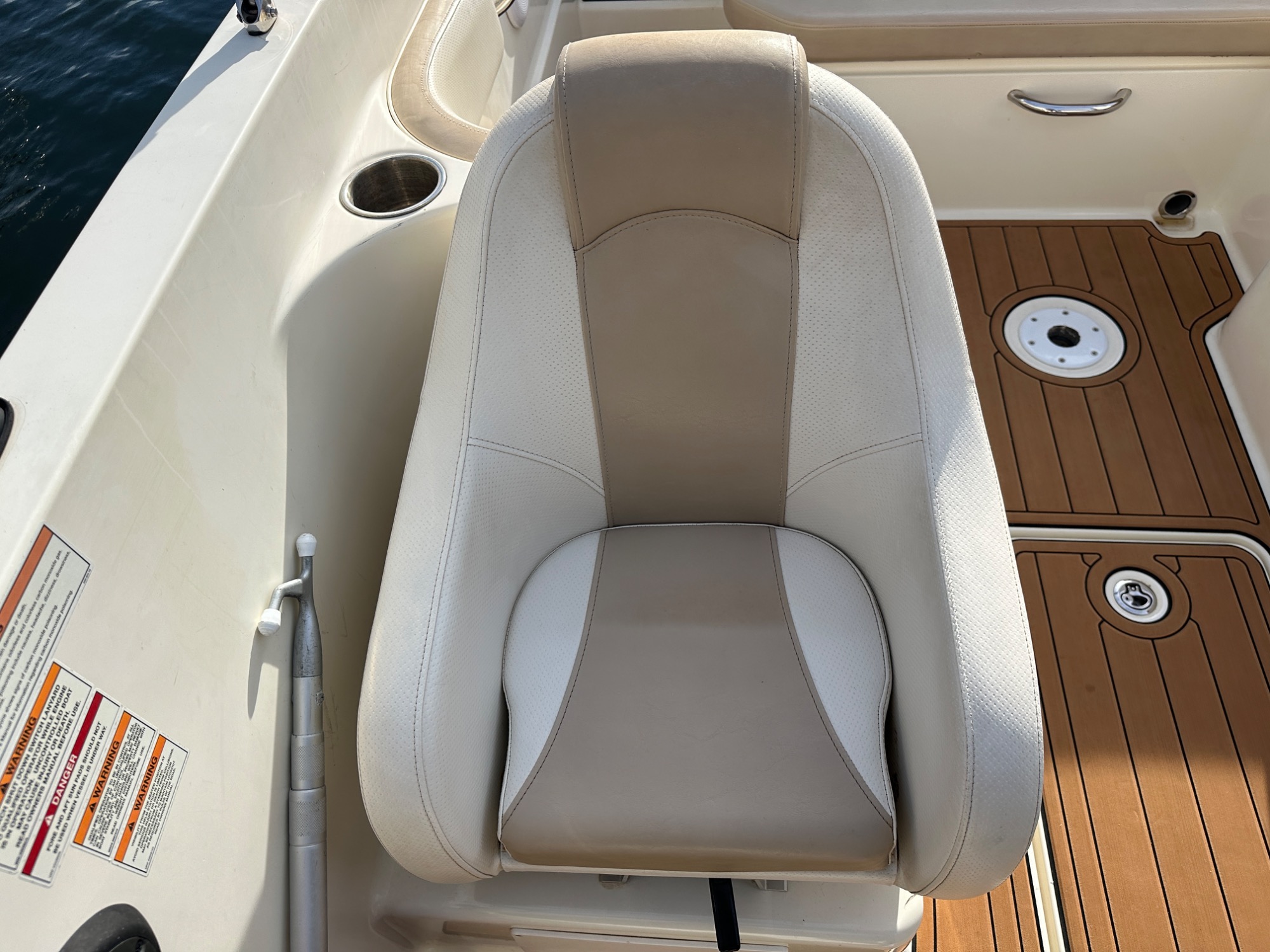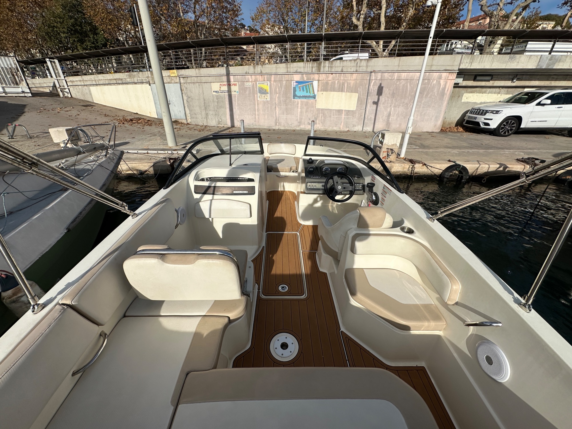 Carène saine, sellerie en bon état, pilotage facile et comportement sécurisant pour la famille comme pour les loisirs tractés. Coussins supplémentaires avant et arrière pour transformer les assises en bains de soleil.