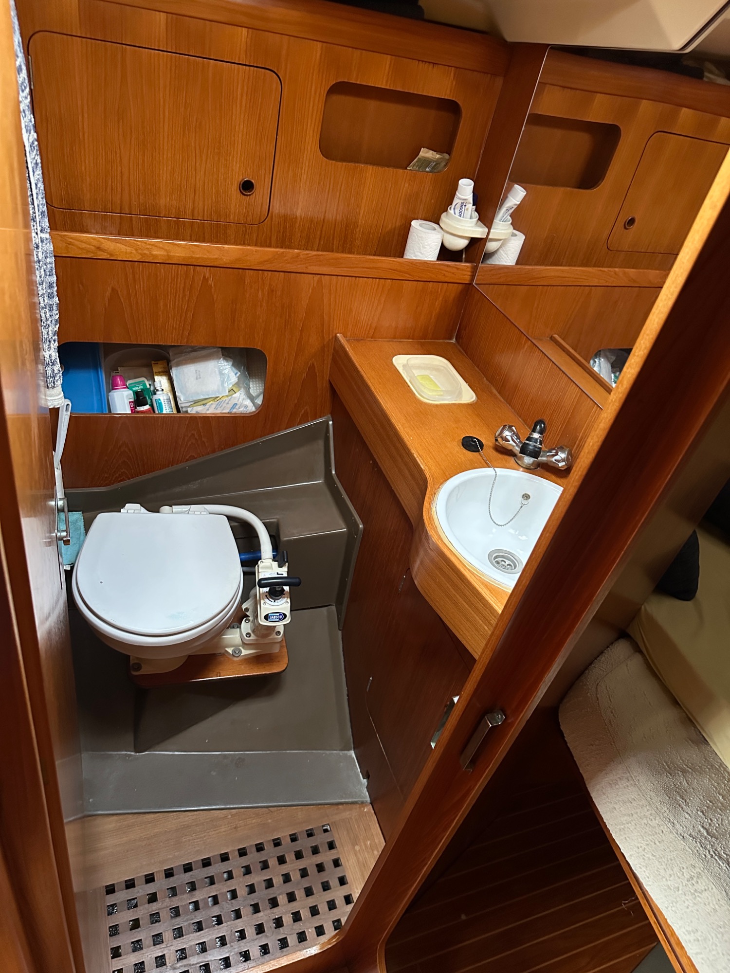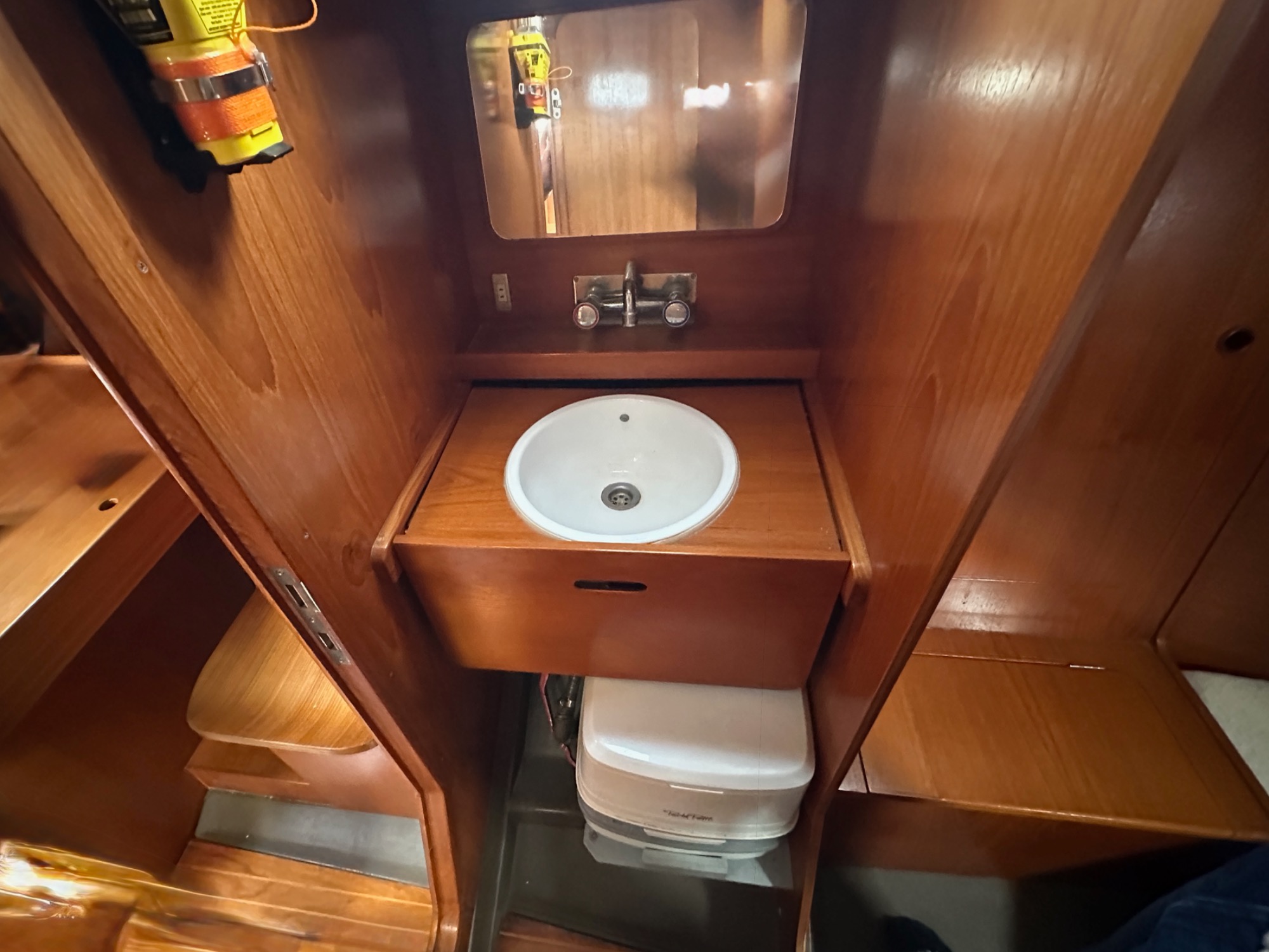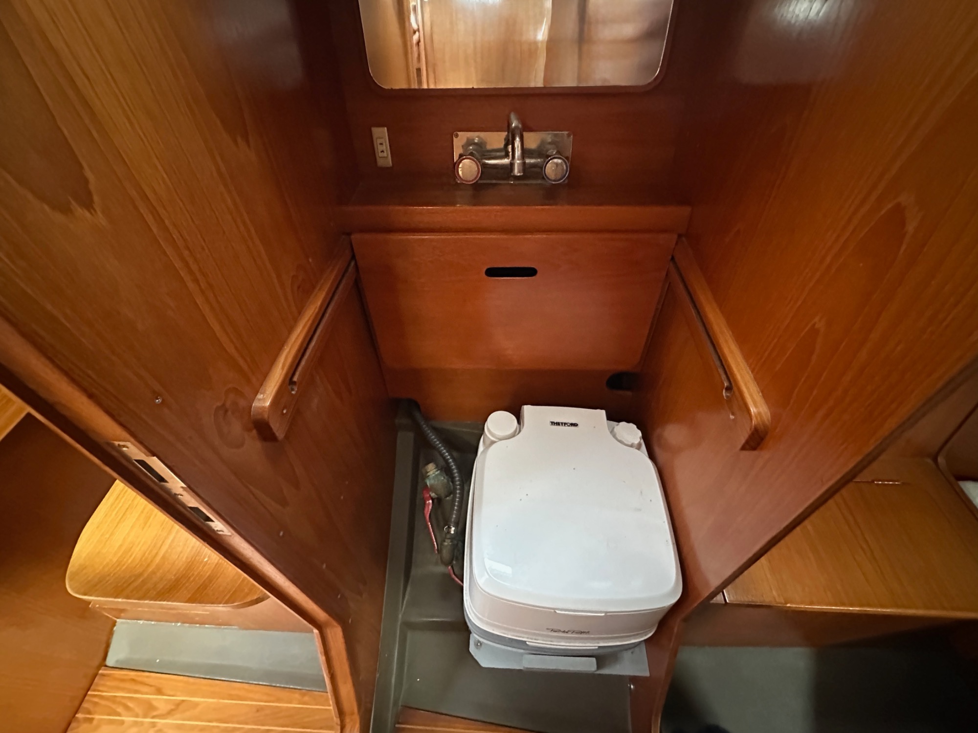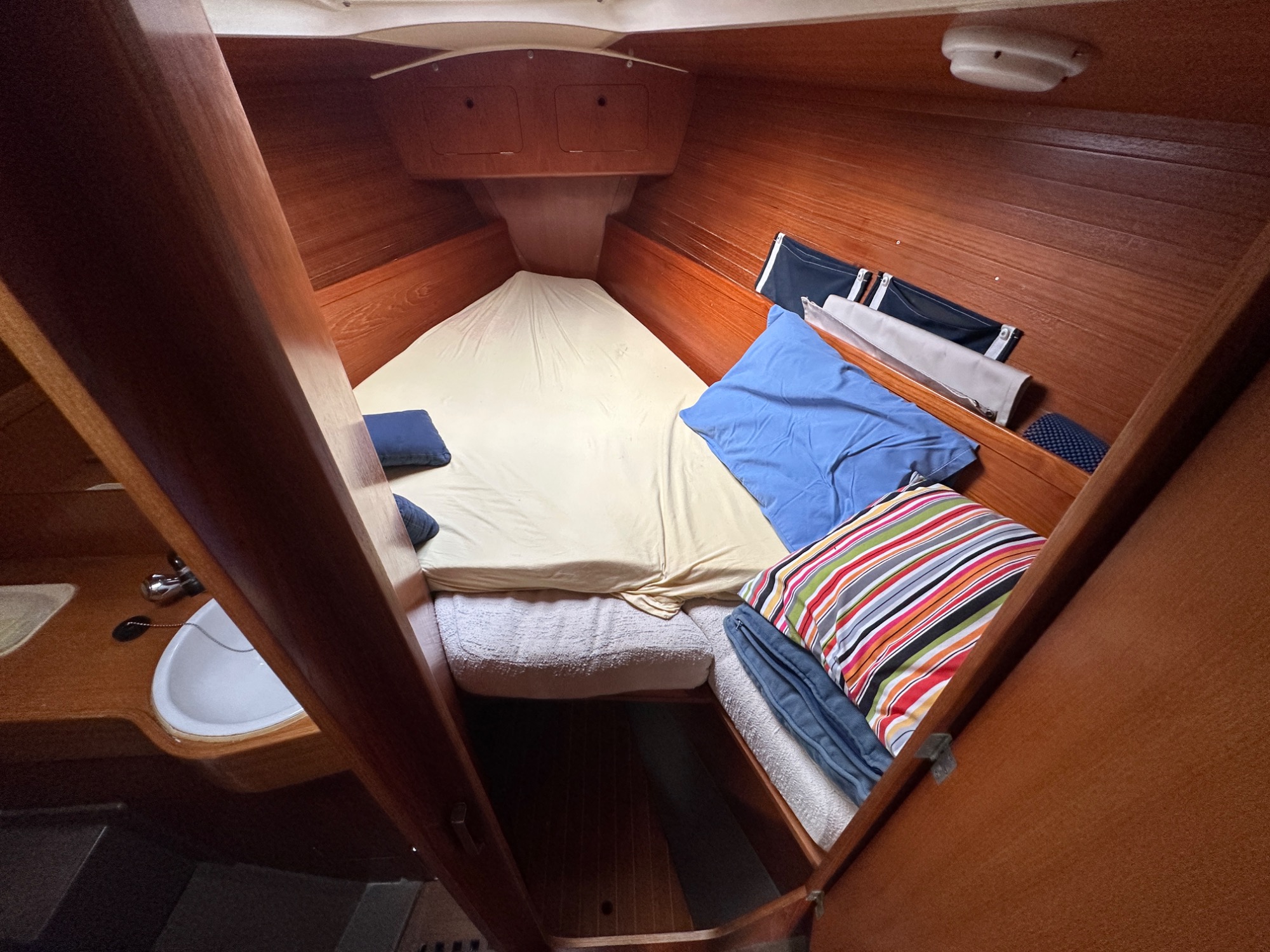 Cabine avec lit double à l'arrière tribord avec cabinet de toilette privé contenant un lavabo retractable et un WC chimique (possibilité de reconnecter un WC marin)