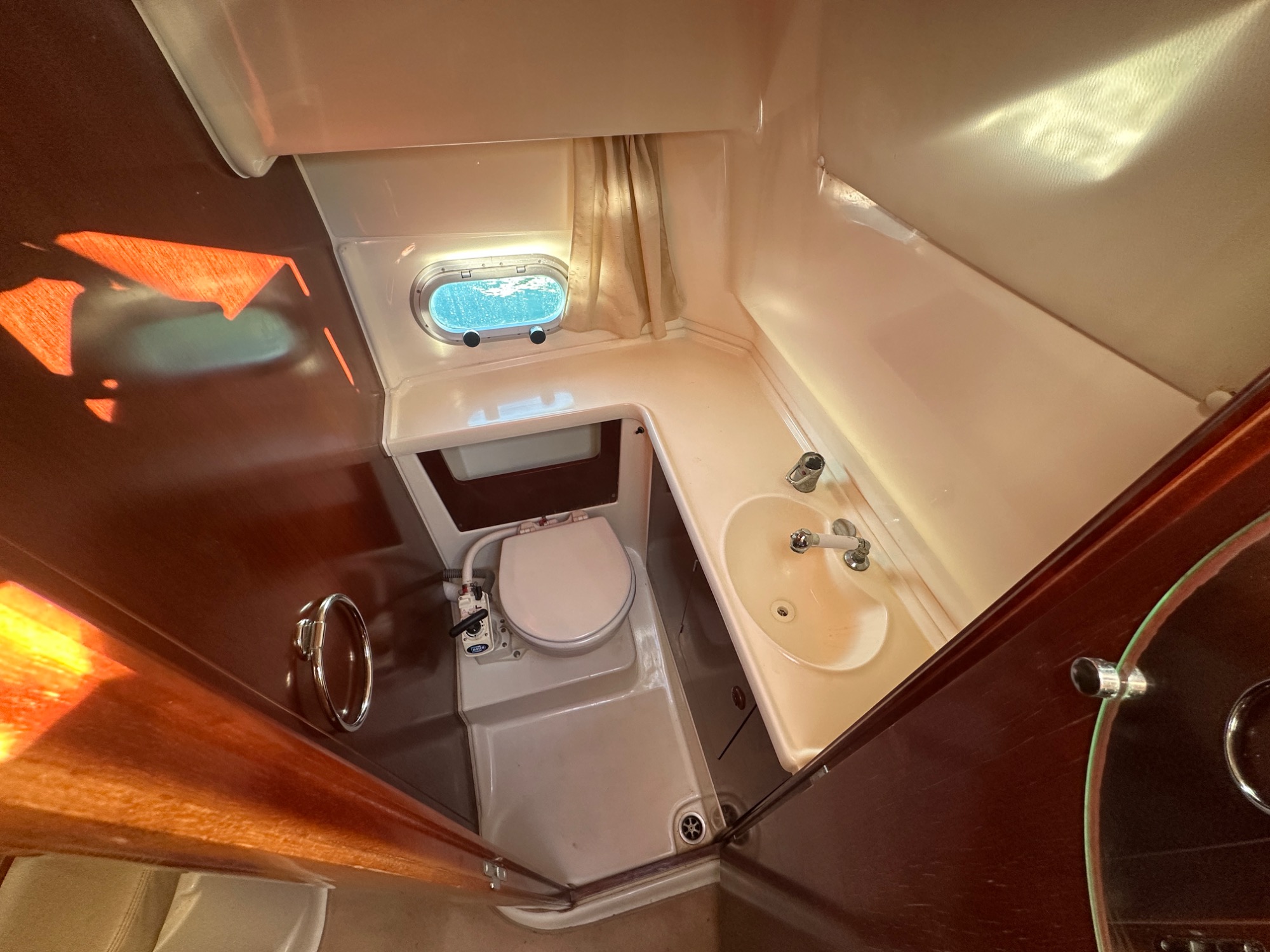 Salle de bain avec lavabo, douche et WC marin, très fonctionnelle