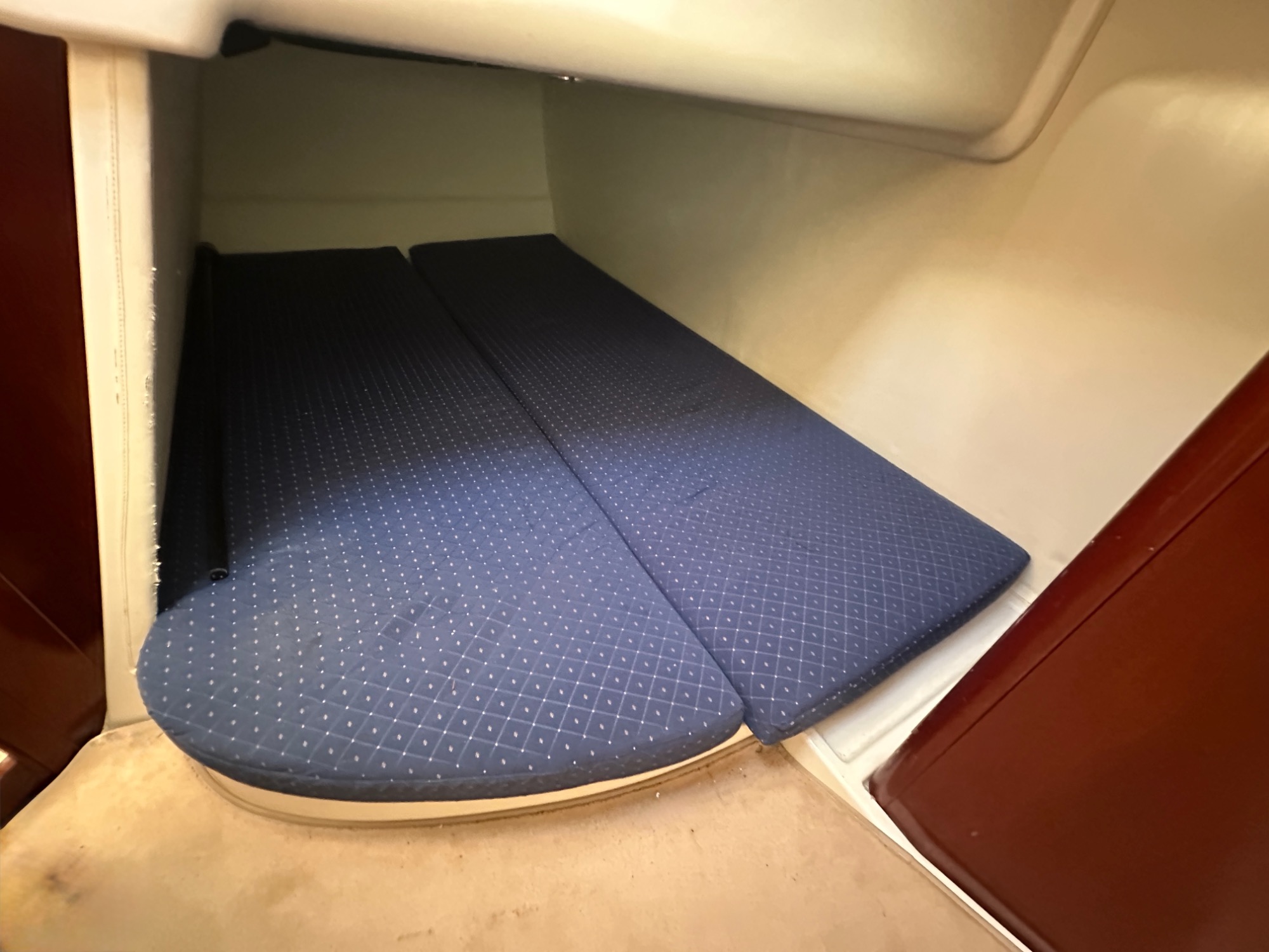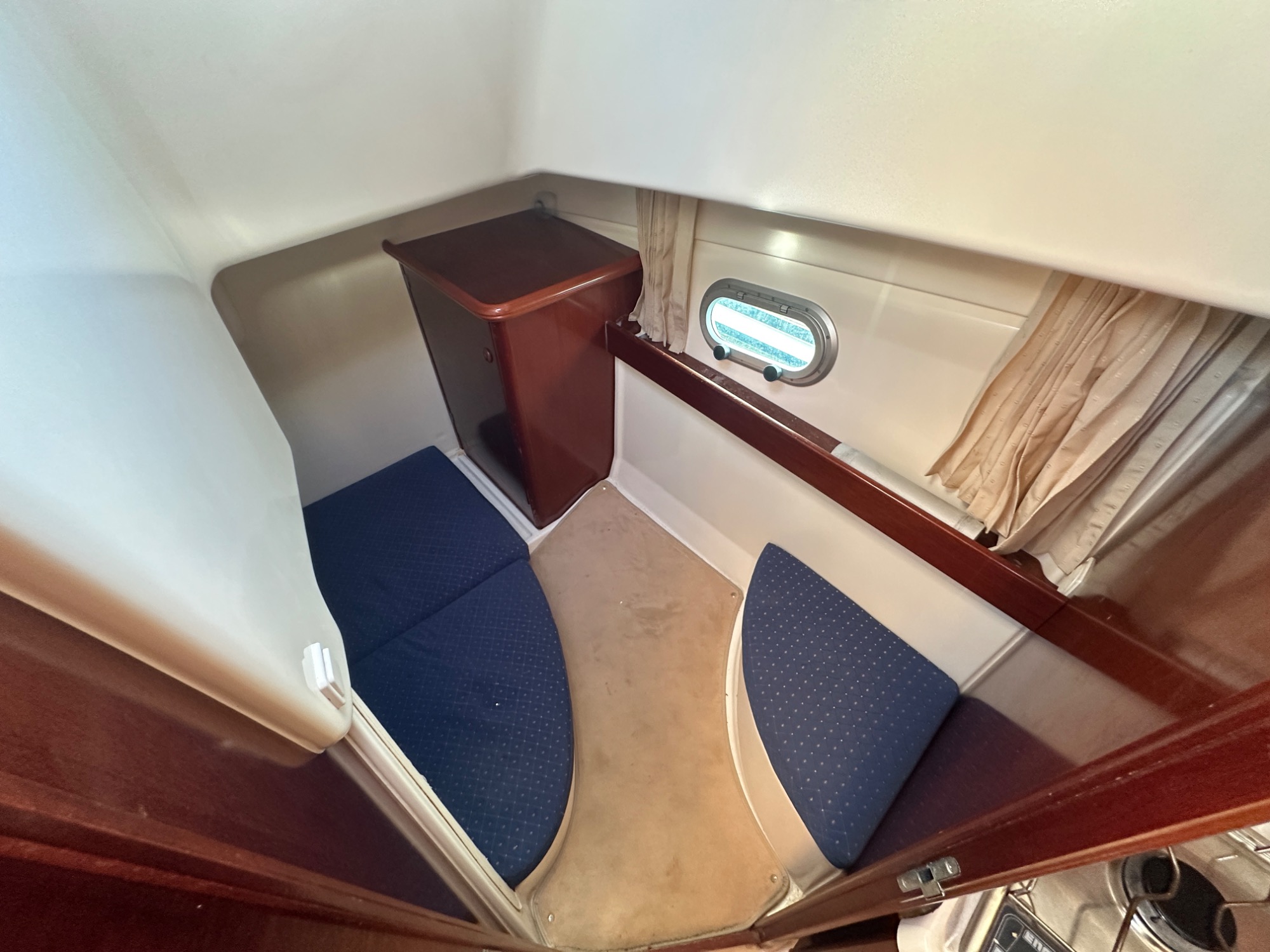 Cabine avec couchage double sous le cockpit, penderie