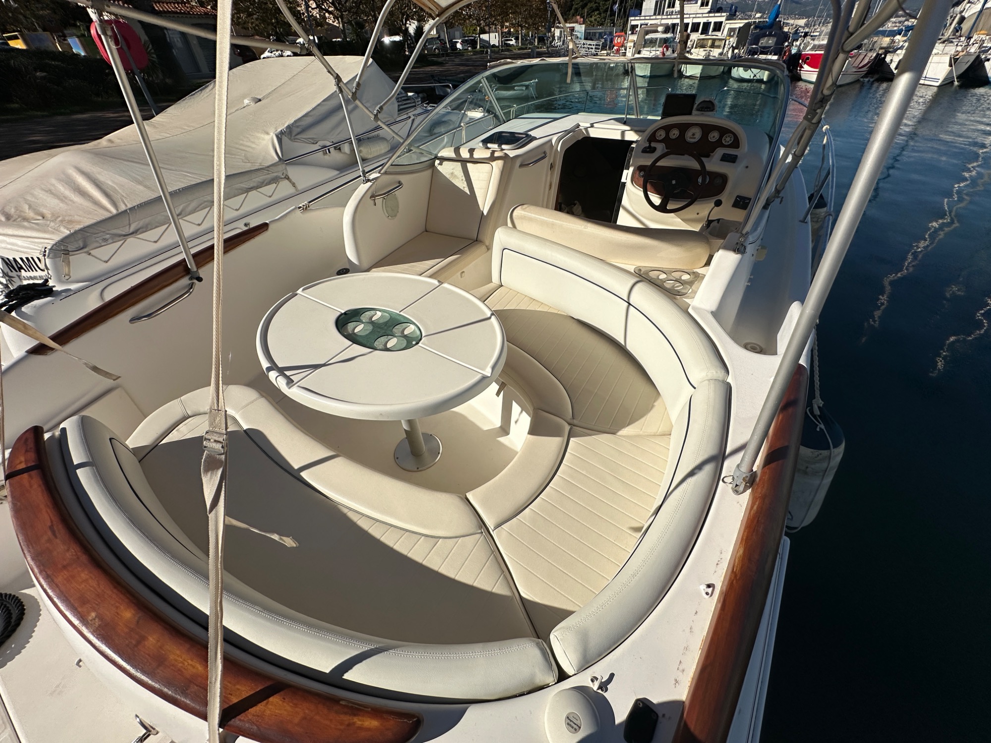 Assises de cockpit en demi rond avec table télescopique se transformant en grand bain de soleil