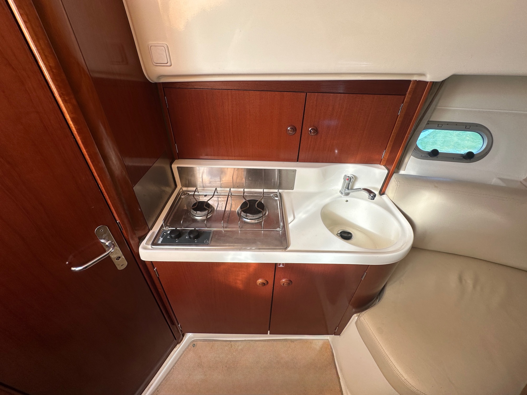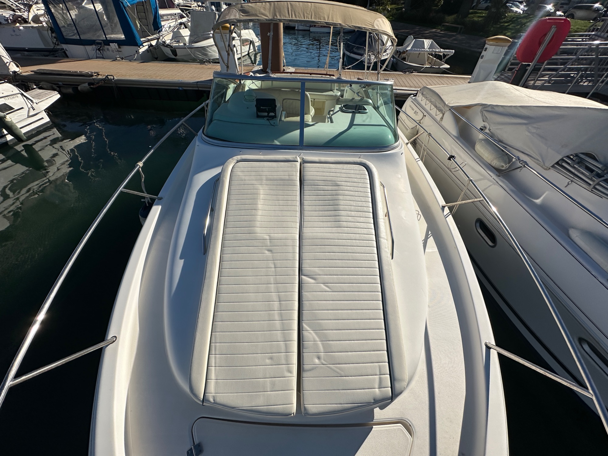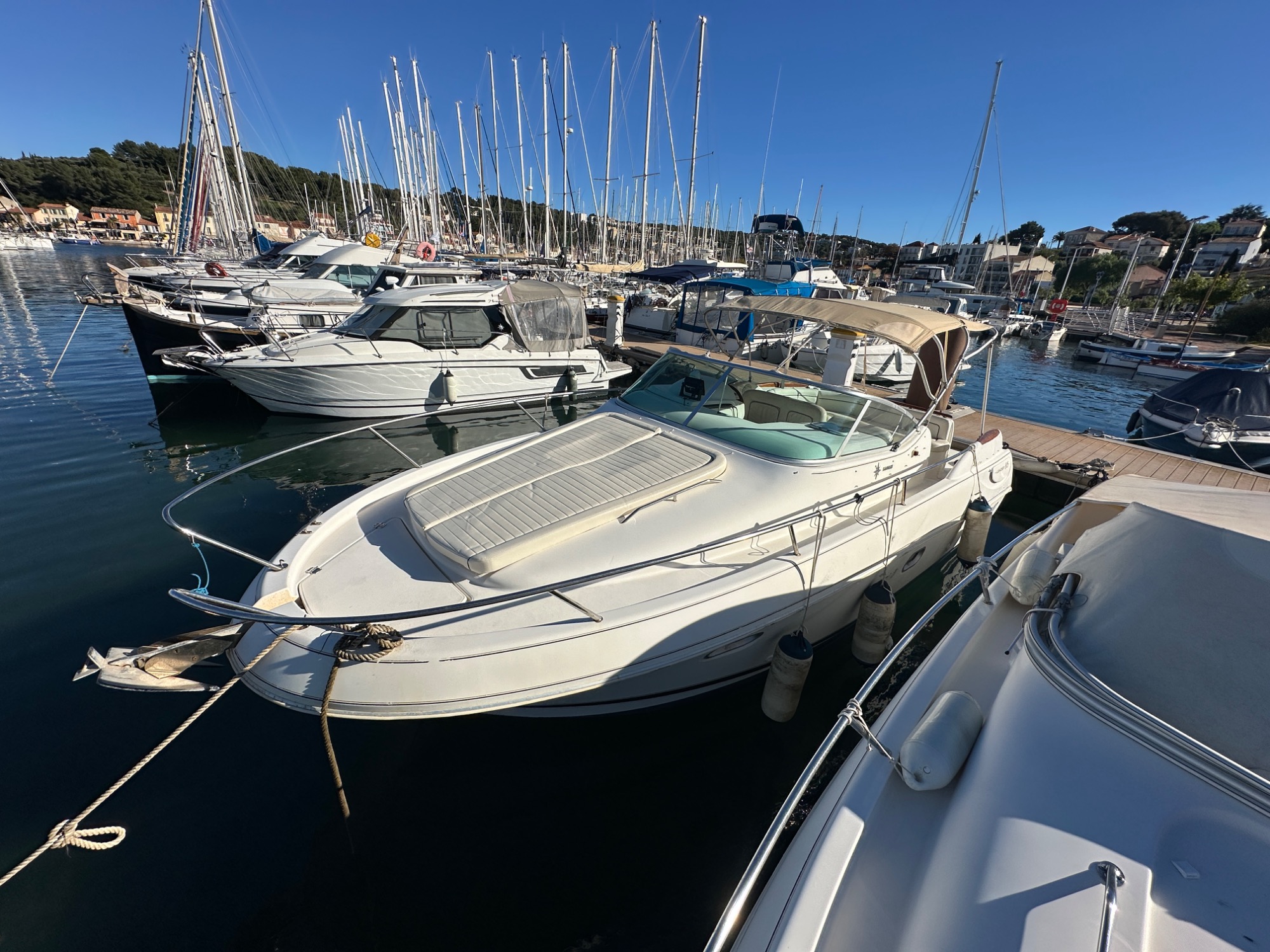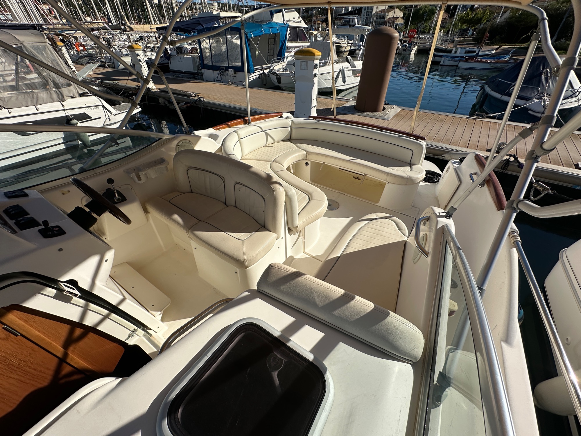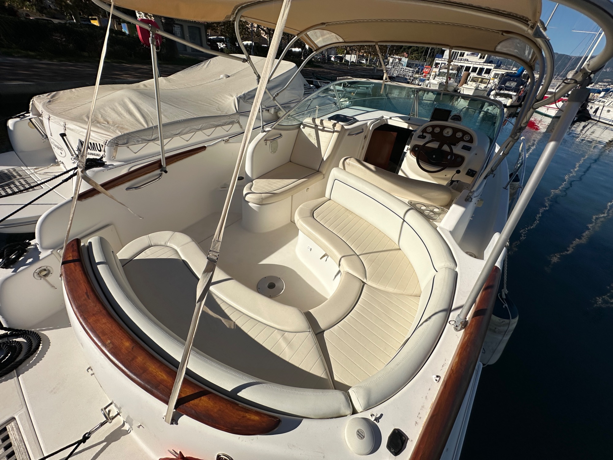 Bateau idéal pour des croisières côtières et sorties familiales. Intérieur spacieux et lumineux avec carré convertible, cabine invités, coin cuisine équipé et salle d’eau avec WC marin pour une belle autonomie.