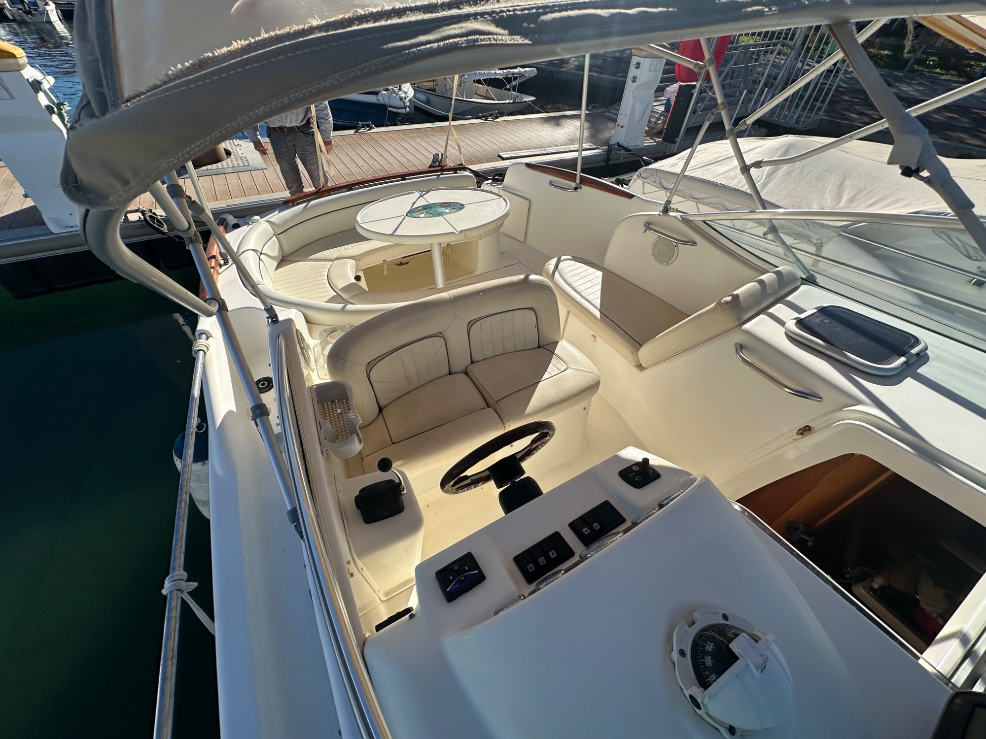 Table de cocpkit télescopique transformable en bain de soleil ou en couchages supplémentaires avec les tauds de fermeture cockpit